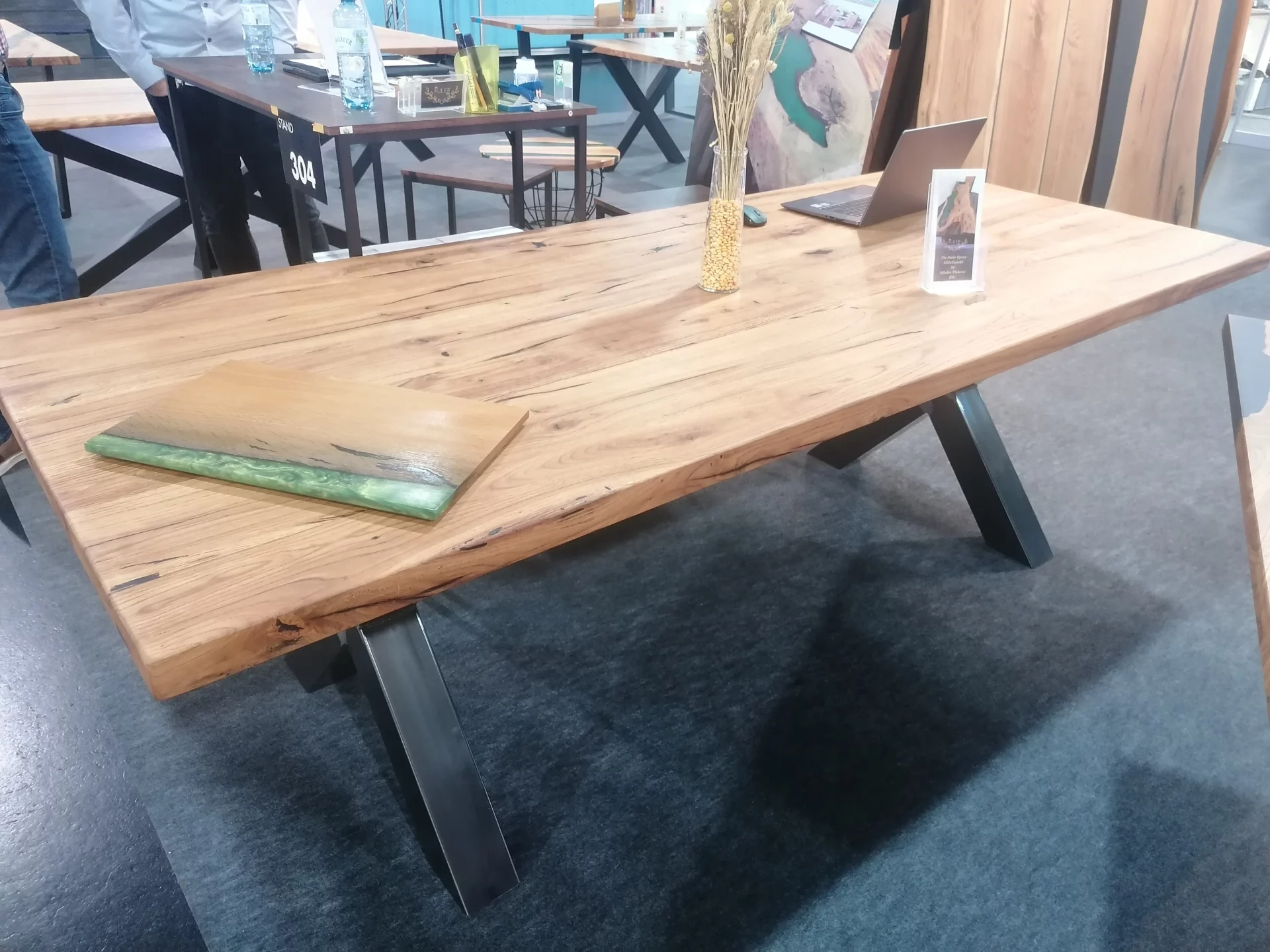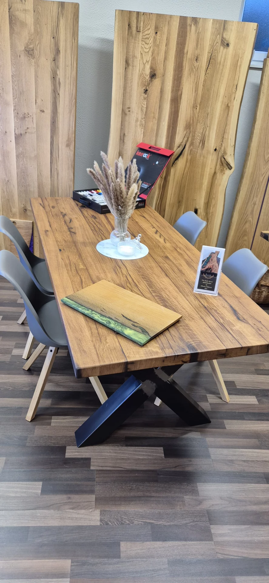 Das markante Metallgestell im X-Design bildet den perfekten Kontrast zum rustikalen Eichenholz und sorgt für höchste Stabilität. Auf Wunsch sind auch andere Gestellvarianten erhältlich, die sich harmonisch mit dem Tischdesign kombinieren lassen.