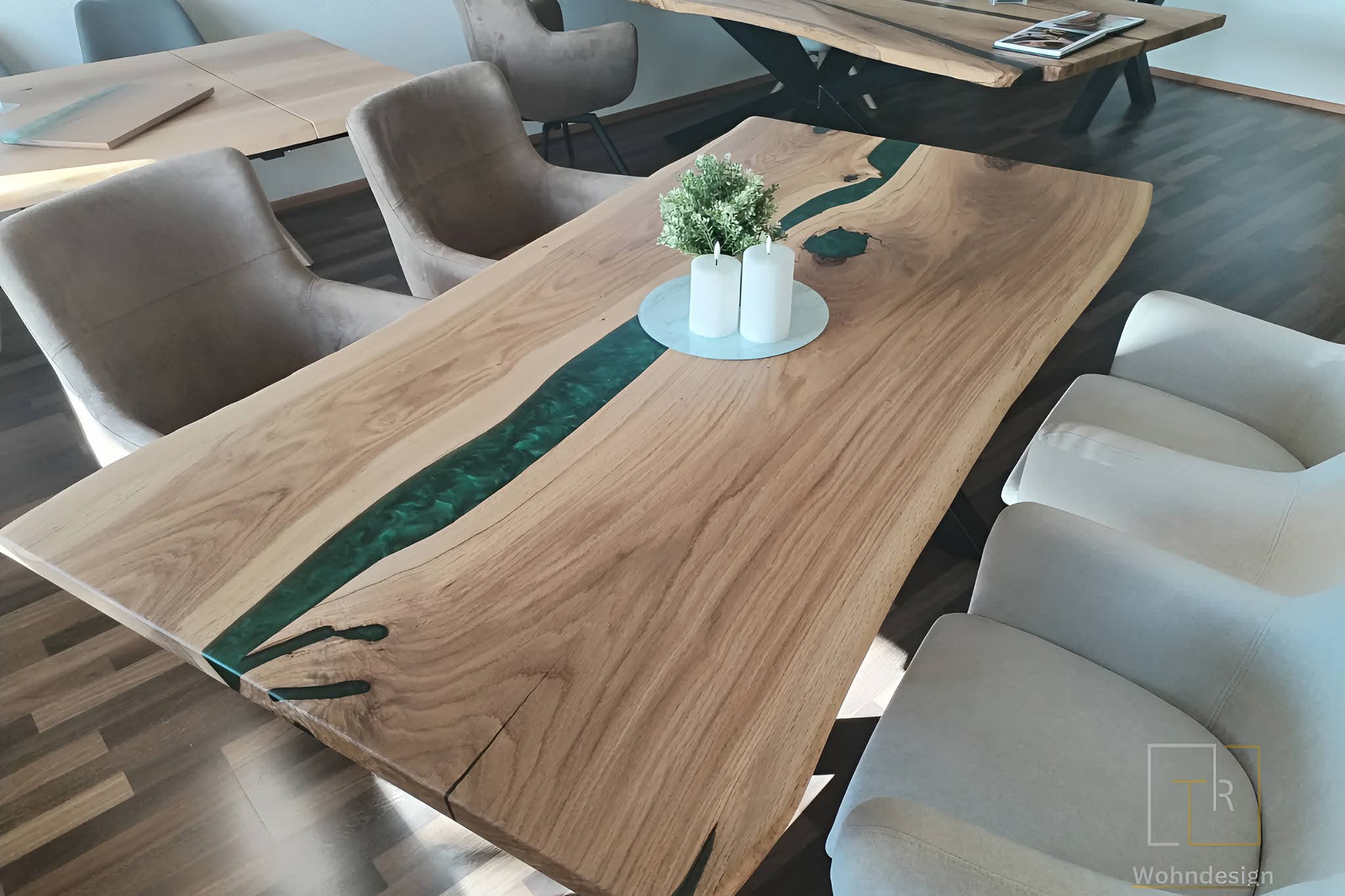 Gefertigt aus Buche, Eiche oder Wildeiche, werden die Platten mit1 bis 2 River-Elementen veredelt. Farbe und Transparenz des Harzes sind frei wählbar – von Vollton über halbtransparent bis hin zu schimmerndem 3D-Look.