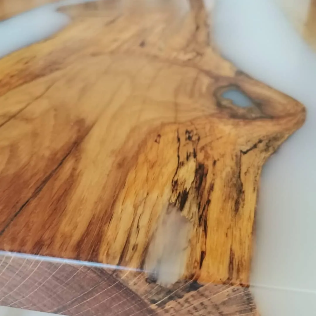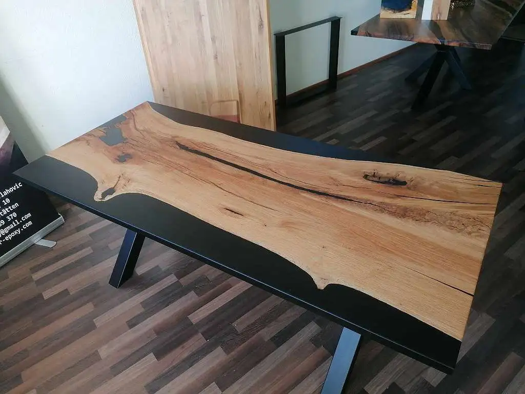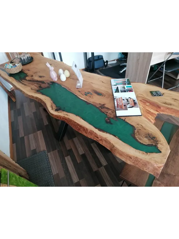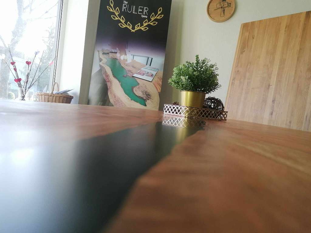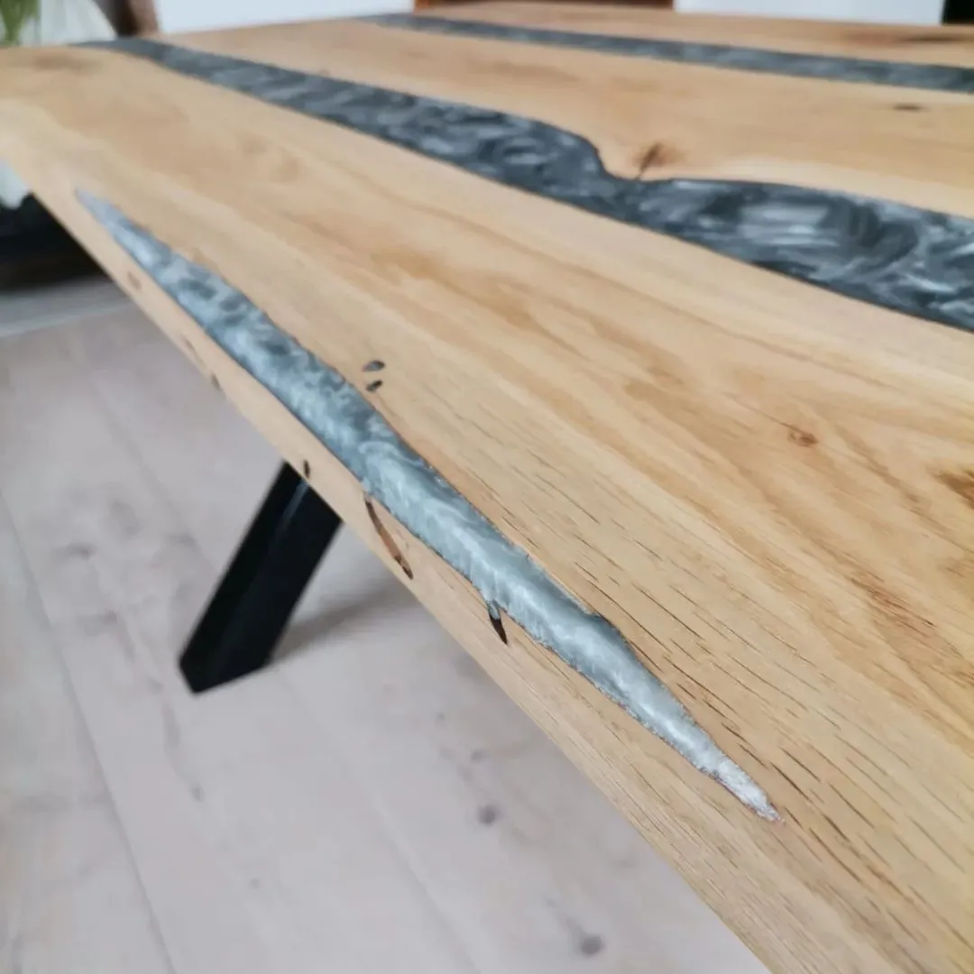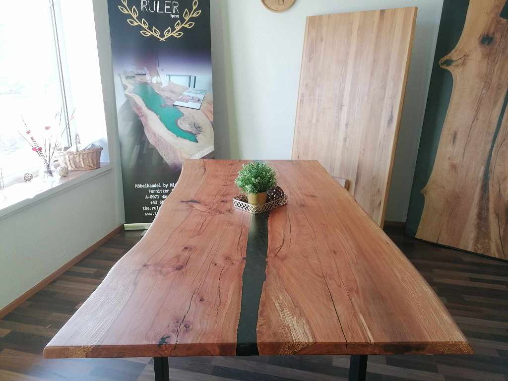 Gefertigt aus Buche, Eiche oder Wildeiche, werden die Platten mit 2 bis 3 Epoxidlinien veredelt. Farbe und Transparenz des Harzes sind frei wählbar – von Vollton über halbtransparent bis hin zu schimmerndem 3D-Look.