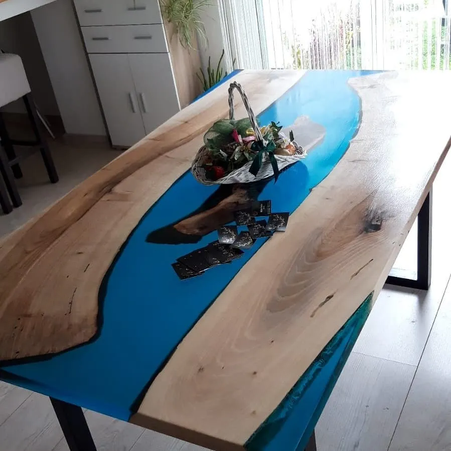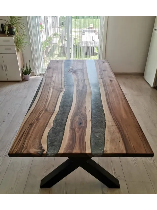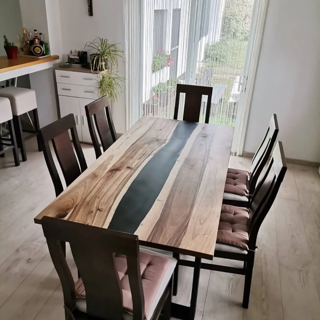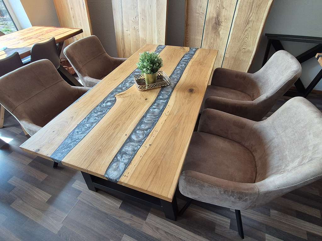Die „River“-Kollektion steht für eindrucksvolle Massivholz-Esstische mit kunstvoll eingegossenem Epoxidharz in eleganter Flussoptik. Jeder Tisch ist ein handgefertigtes Unikat, das natürliche Holzstruktur mit der Tiefe des Harzes vereint – modern, ausdrucksstark und zeitlos.